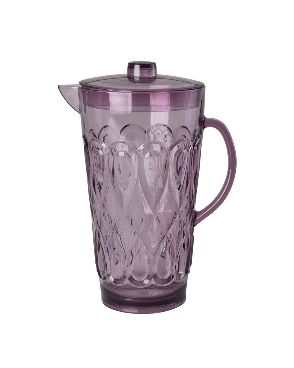 Großer und schöner Krug im Retro-Design aus lila Acryl mit spiralförmiger Facettierung. Er ist ein dekorativer Blickfang auf jedem Tisch und zudem äußerst praktisch: Dank des Deckels kannst du ihn ihn problemlos mit in den Garten nehmen, ohne befürchten zu müssen, dass Fliegen oder Wespen in den Saft, das Wasser oder was auch immer du einfüllst, gelangen.